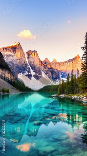 Majestic mountain landscape with turquoise lake and pine forest at sunrise