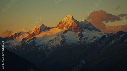 Majestic Mountain Peak Bathed in Golden Light at Sunset with Snow-Capped Summits and Dramatic Clouds in the Background