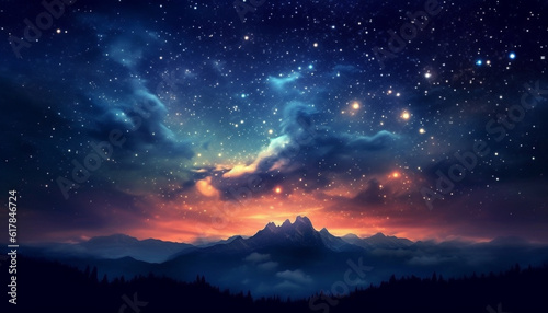Majestic mountain peak glows in star filled galaxy, a nature adventure generated by AI