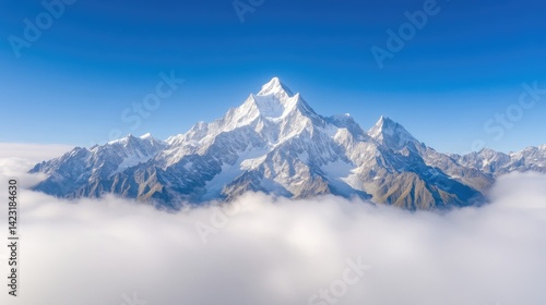 Majestic mountain peak piercing through clouds. Vast snowy summit, surrounded by hazy clouds, with dramatic mountain ranges below. Clear blue sky