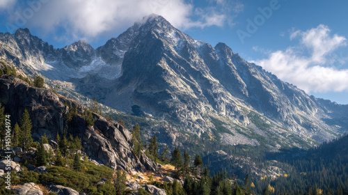 Majestic mountain peak rises dramatically against a partly cloudy blue sky, showcasing the rugged beauty of nature's landscape and a sense of adventure on high.