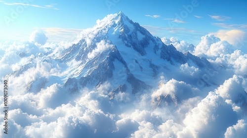 majestic mountain peak rises sharply through a sea of fluffy white clouds under a radiant blue sky creating a dramatic contrast that captures the aweinspiring beauty of nature