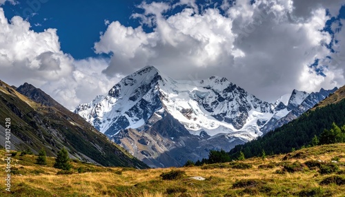 Majestic Mountain Peak with Snowy Slopes and Dramatic Clouds Alpine Scenery