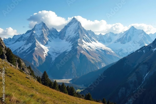Majestic mountain peaks with snow and clouds in the distance, rugged, distance, wild