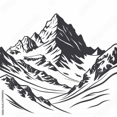 Majestic mountain range illustration, showcasing rugged peaks and valleys, perfect for adventure, nature, and outdoorthemed designs and projects