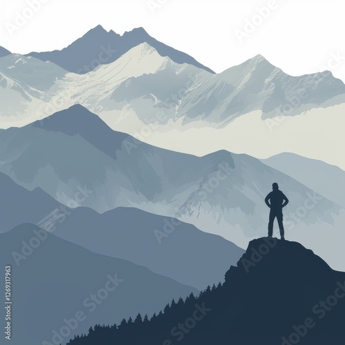 Majestic Mountain Range View Silhouette of a Hiker Contemplating Scenic Vista