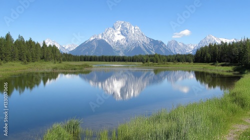 Majestic Mountain Reflection in a Serene Lake: A Breathtaking Panorama of Tranquil Nature in Wyoming