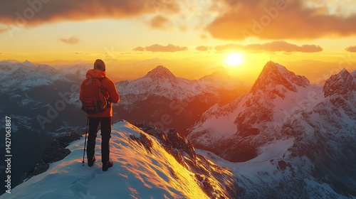 Majestic Mountain Sunset Hiker Winter Landscape Breathtaking View Stunning Panorama Golden Hour Alpine Scenery Adventure Travel Snowcapped Peaks