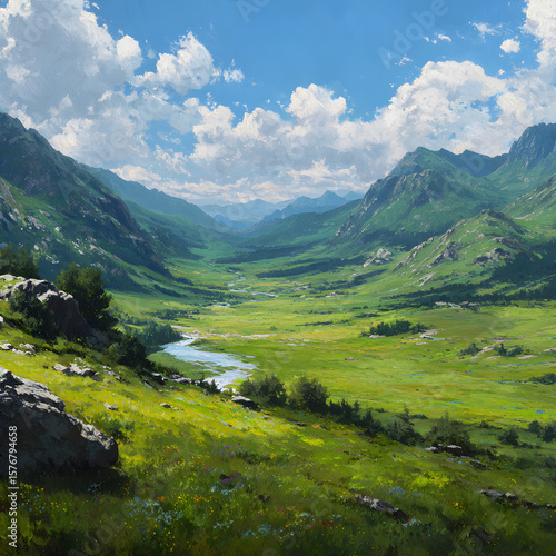 Majestic Mountain Valley Panorama with Wildflowers and a Winding River