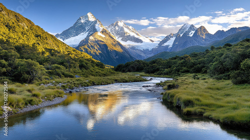 Majestic mountains reflect in serene river, surrounded by lush greenery and tranquil landscape