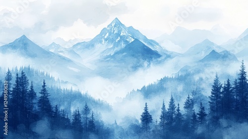 Majestic mountains rise above misty forests in tranquil blue tones during a peaceful morning