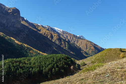 Majestic mountains tower over lush valley with dense forests and rolling hills, under clear blue sky, showcasing nature's grandeur and tranquility. Kabardino-Balkaria, Chegemsky district