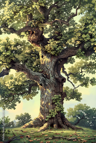 Majestic Oak Tree Illustration Captured at the Peak of Grandeur Encompassing Strength and Resilience Amidst a Serene Environment.