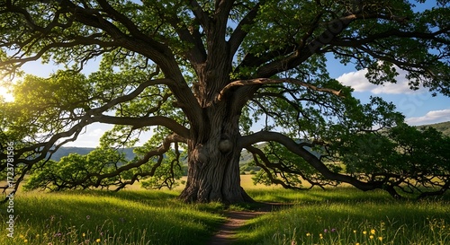 Majestic Oak Tree in a Sunny Meadow Landscape.