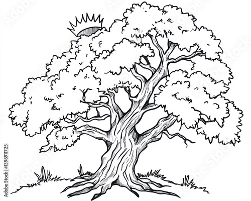 Majestic oak tree, sunlit field, nature illustration, book cover