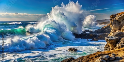 Majestic Ocean Waves Crashing on Rocky Shoreline - Nature's Power Unleashed in Stunning Seascape Photography for Coastal Landscapes and Dramatic Weather Conditions