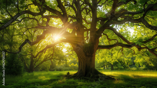 Majestic old oak tree with textured bark and sprawling branches, bathed in sunlight filtering through lush green leaves