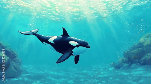 Majestic orca gliding through deep blue ocean waters, showcasing its powerful form and vibrant markings, surrounded by the tranquility of the sea.