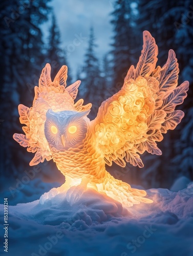 Majestic Owl Ice Sculpture with Floral Wings in Arctic Glow