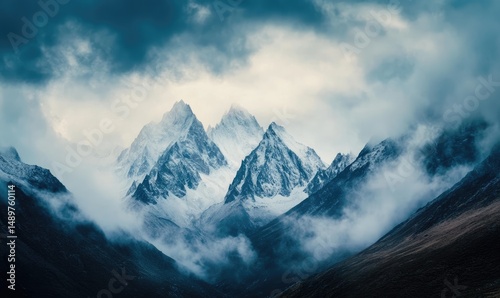 Majestic peaks shrouded in a mystical, dramatic atmosphere. Misty mountaintops pierce through a brooding sky