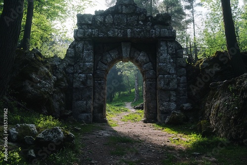 Majestic portal to another world glows amidst ethereal landscape with rolling clouds and sunlit greenery