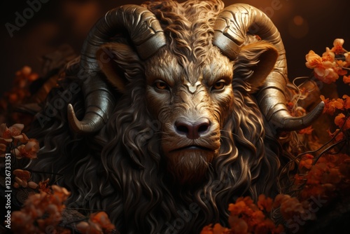 Majestic ram sculpture, autumnal setting, fantasy art, book cover.