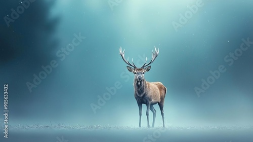 Majestic red deer stag stands in a misty forest clearing, antlers prominent.
