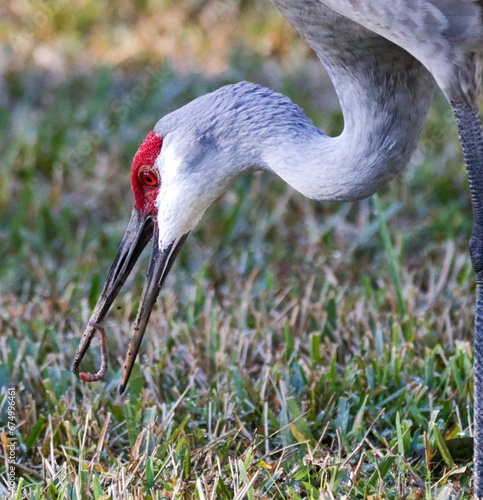 Majestic red-crowned crane standing in lush green grass, consuming a small worm