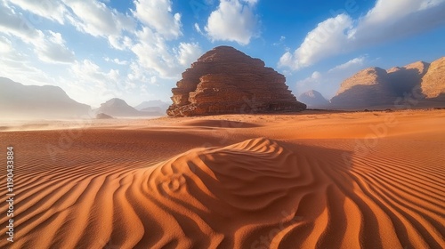 Majestic sandstone formations rise above the vast Arabian desert