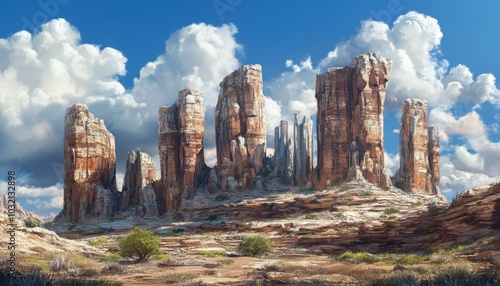 Majestic sandstone formations rise against a vibrant sky in a breathtaking landscape