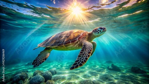 Majestic Sea Turtle Gracefully Navigating Sunlit Ocean Depths