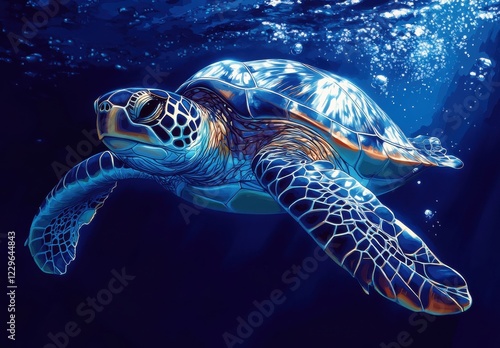 Majestic Sea Turtle Swimming Gracefully Through Clear Ocean Waters Surrounded by Bubbling Air Bubbles and Vibrant Underwater Scenery