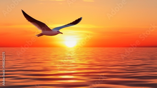 Majestic Seagull Soaring Over Tranquil Ocean Waves at Sunset with Vibrant Orange and Yellow Sky