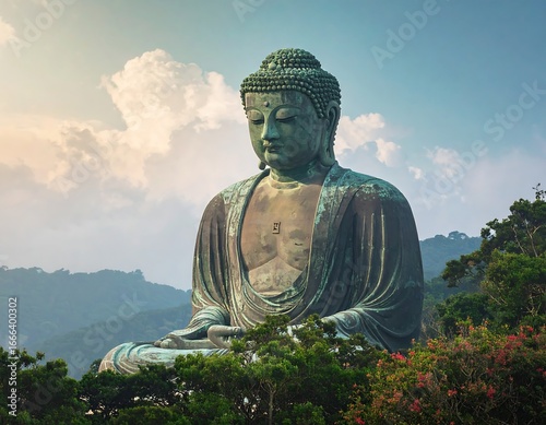 Majestic seated buddha statue, serene against a backdrop of lush greenery and tranquil sky.
