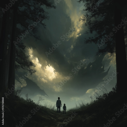 Majestic Sky Over Forest Path with Silhouetted Figures