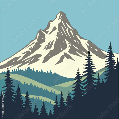 Majestic snow capped mountain peaks over rolling green hills and pine forests