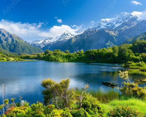 Majestic Snow Capped Mountains Reflected in a Serene Alpine Lake Surrounded by Lush Forests in New Zealand s Pristine Wilderness