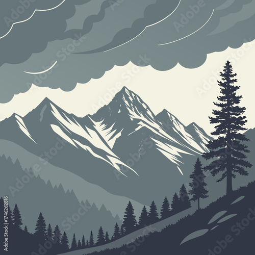 Majestic snow capped mountains with pine trees and dramatic clouds