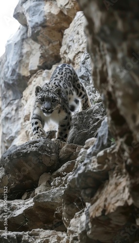 Majestic snow leopard perched on a rocky ledge, showcasing its stunning camouflage and grace