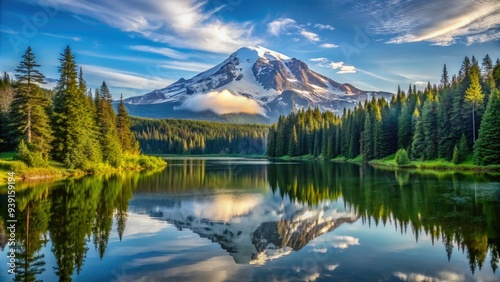 Majestic snow-capped Mount Rainier stands tall amidst lush green forests and serene lakes, symbolizing the natural beauty and outdoor essence of Washington State.