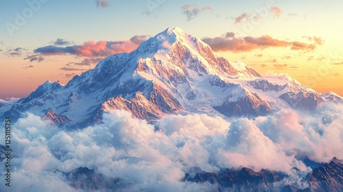 Majestic snow-capped mountain at sunset surrounded by colorful clouds