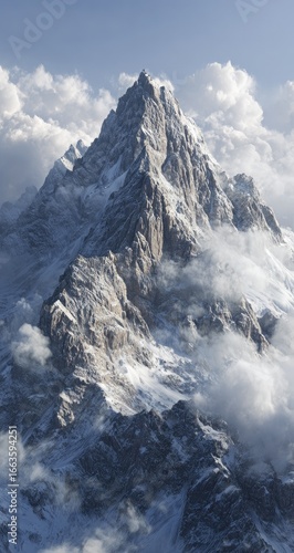 Majestic snow-capped mountain peak piercing a cloudy sky