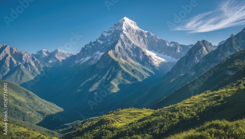 Majestic snow-capped mountain peak surrounded by lush green valleys and rugged terrain under a clear blue sky Copy Space