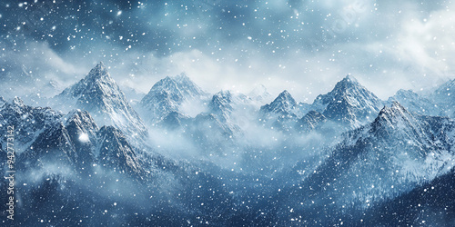 Majestic Snow-Capped Mountain, Snowy Peaks and Misty Clouds, Dramatic Snowstorm Over Rugged Mountain Peaks, Awe-Inspiring Mountain Views.