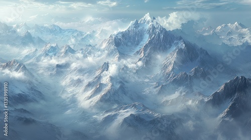 Majestic snow-capped mountains, aerial view, cloudy sky, nature background. Possible use stock photo