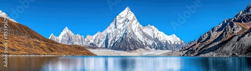 Majestic Snow-Capped Mountains Reflection in Serene Blue Lake Under Cloudless Sky