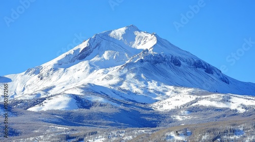 Majestic snow-covered mountain under a clear blue sky, showcasing nature's beauty and grandeur.