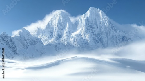 Majestic snow-covered mountains under a clear blue sky, creating a serene winter landscape.