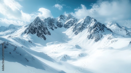 Majestic snow-covered mountains under a clear blue sky with soft clouds