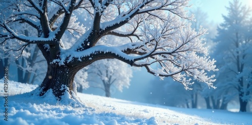 Majestic snow-covered tree with intricate branches and sparkling ice, frosty, scenery